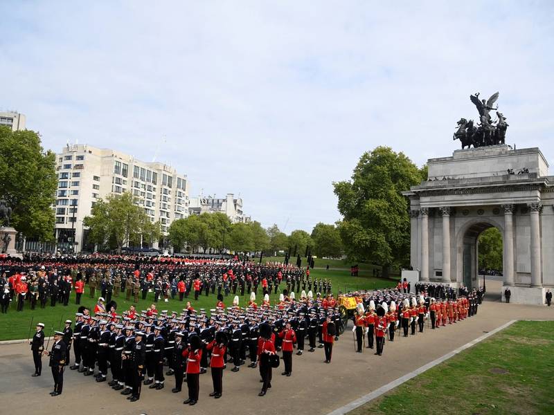 تابوت ملکه توسط گاردهای سلطنتی و نیروهای مسلح از بریتانیا، کانادا، آسترالیا و نیوزیلند و بر روی یک ارابه توپ به محل مراسم ادای احترام و وداع منتقل شد.