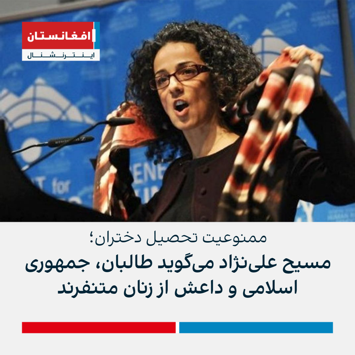 مسیح علینژاد، فعال حقوق بشر ایرانی با نشر ویدیویی از دانشجویان دختر افغانستان که از ورود به دانشگاه ممنوع شدهاند، نوشت: «رژیمهای زنستیز، چه طالبان، چه جمهوری اسلامی در ایران و چه داعش، یک وجه مشترک دارند: از زنان متنفرند.»