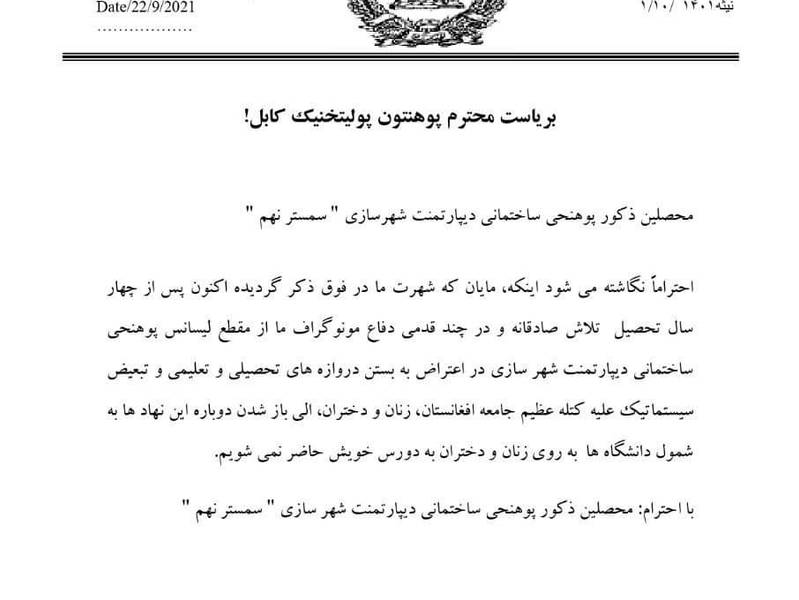 دانشجویان سمستر نهم دیپارتمنت شهرسازی دانشکده ساختمانی دانشگاه پولیتخنیک کابل روز جمعه اعلام کردند که «تا بازشدن دوباره درب دانشگاهها به روی دختران» شرکت در صنفهای درسی را تحریم کردهاند.