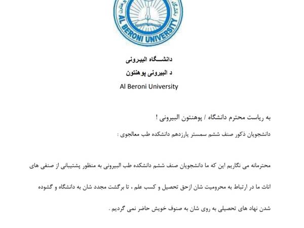 در ادامه تحریم صنفهای درسی توسط دانشجویان پسر، دانشجویان دانشکده طب دانشگاه البیرونی هم حضور در صنفهای درسی را تحریم کردند. دانشجویان صنف ششم دانشکده طب این دانشگاه در بیانیهای گفتند تا برگشت مجدد دختران به دانشگاه و بازگشایی نهادهای تحصیلی به روی آنها، در صنف حاضر نمیشوند.