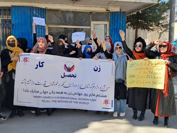گروهی از زنان روز سهشنبه به مناسبت فرا رسیدن ۸ مارچ، روز جهانی زن، در مقابل دفتر سازمان ملل در کابل، علیه سیاستهای «زنستیزانه» طالبان اعتراض کردند.