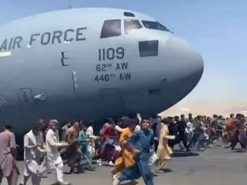 پس از قدرتگیری طالبان در افغانستان، هزاران نفر در محوطه فرودگاه کابل بهسوی یک هواپیمای نظامی در حال پرواز هجوم بردند و شماری به امید فرار، خود را به بدنه آن آویزان کردند.