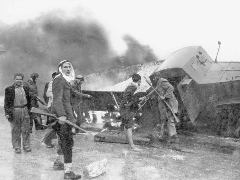 در ۱۴ می ۱۹۴۸، درست یک روز پیش از پایان رسمی قیمومیت بریتانیا، رهبران یهودی موجودیت دولت اسرائیل را اعلام کردند. چند ساعت بعد، کشورهای عرب همسایه، مصر، اردن، سوریه، لبنان و عراق، ارتشهایشان را به فلسطین فرستادند تا مانع تحقق طرح تقسیم و تشکیل دولت یهودی شوند. جنگی آغاز شد که در تاریخ به «جنگ ۱۹۴۸» یا از نگاه فلسطینیان به «نکبه» (فاجعه) مشهور است.
