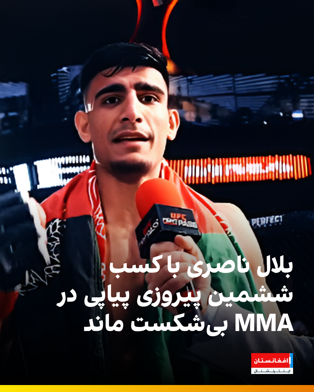 بلال ناصری، ورزشکار ۲۳ ساله افغانستان در رشته هنرهای رزمی ترکیبی (MMA)، در شصتوسومین دور مسابقات سازمان «یونیفاید» کانادا به برتری رسید. او در شهر تورنتو مقابل «جواش واکینز» از ترینیداد و توباگو قرار گرفت و با پیروزی مقتدرانه رکورد شکستناپذیری خود را حفظ کرد.