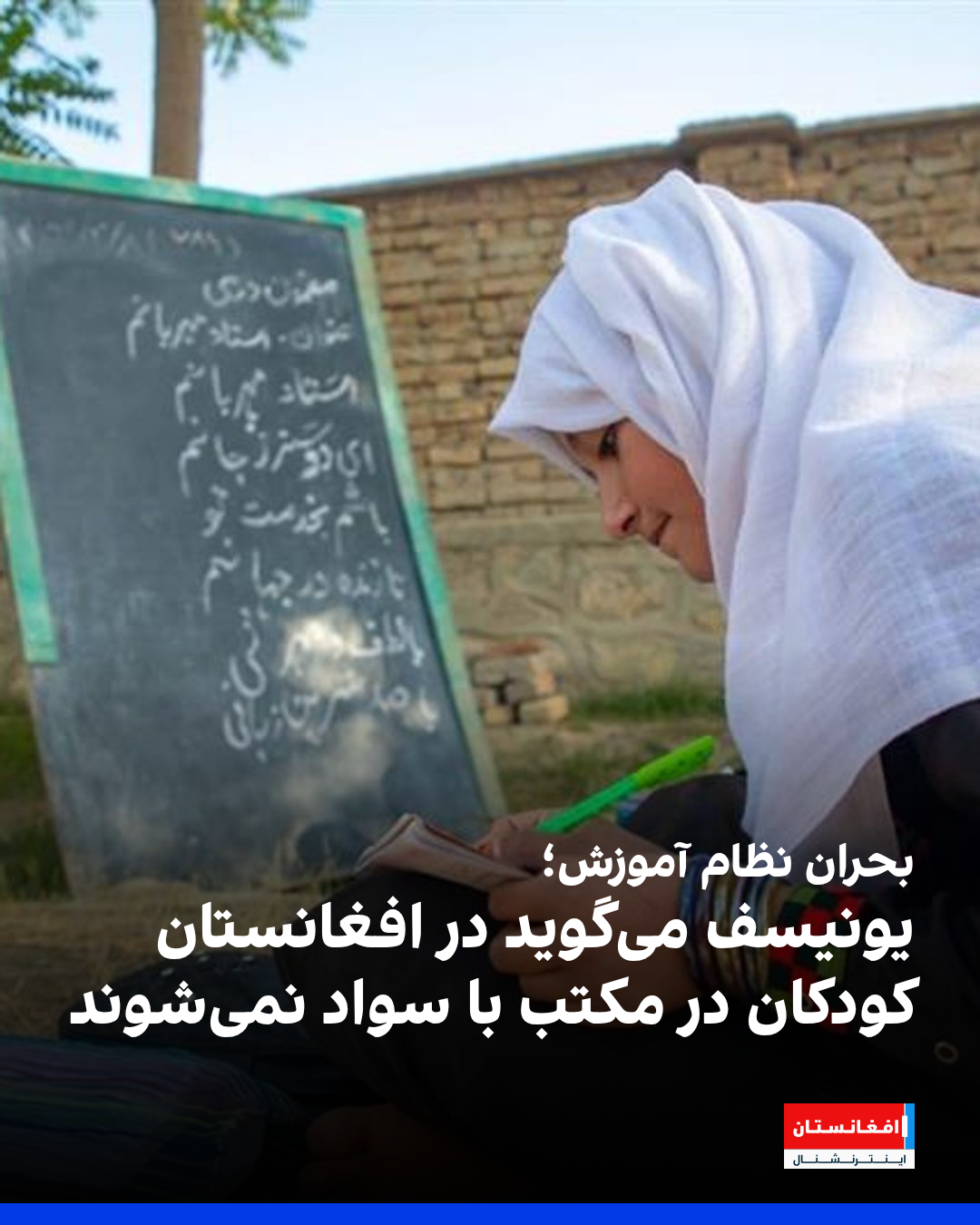 صندوق کودکان سازمان ملل (یونسیف) اعلام کرد که بیش از ۲ میلیون کودک از آموزش محروم اند و بیش از ۹۰ درصد کودکان دهساله در افغانستان قادر به خواندن متنهای ساده نیستند. به گفته این سازمان، شاگردان «مکتب میروند اما چیزی یاد نمیگیرند.»