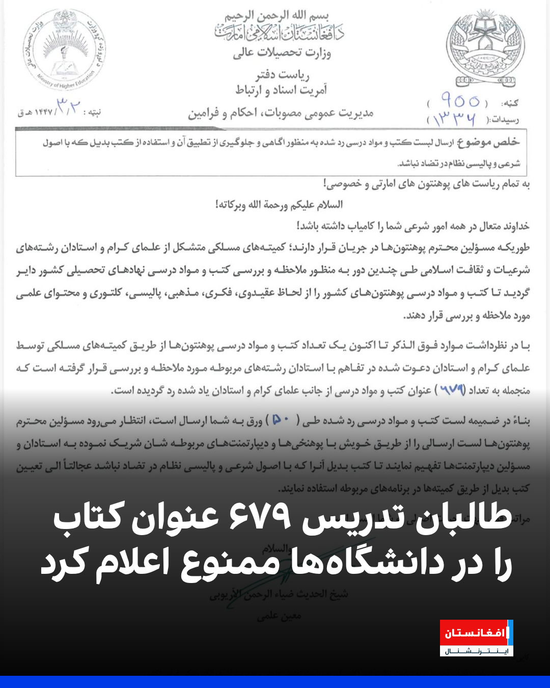 وزارت تحصیلات عالی طالبان، ۶۷۹ عنوان کتاب علمی و مواد آموزشی را در دانشگاههای دولتی و خصوصی افغانستان ممنوع اعلام کرد.