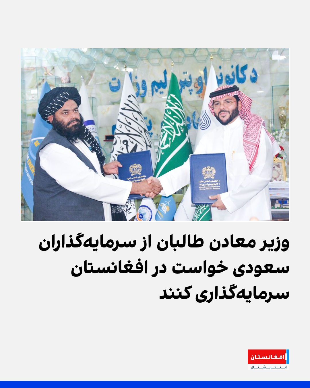 وزیر معادن طالبان گفته است «ما میخواهیم با سرمایهگذاران عربستان سعودی بهصورت مشترک کار کنیم. برای ما مایه افتخار است که شما علاقهمند سرمایهگذاری در منابع معدنی افغانستان هستید.»