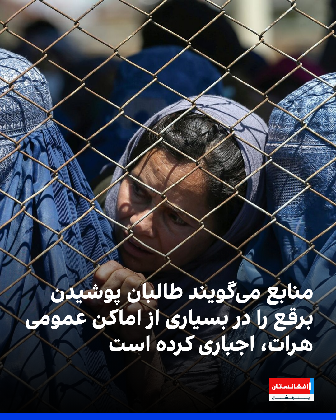 منابع در ولایت هرات میگویند که والی طالبان پوشیدن برقع برای زنان را به خاطر دریافت خدمات و ورود به مراکز خرید اجباری کرده است.