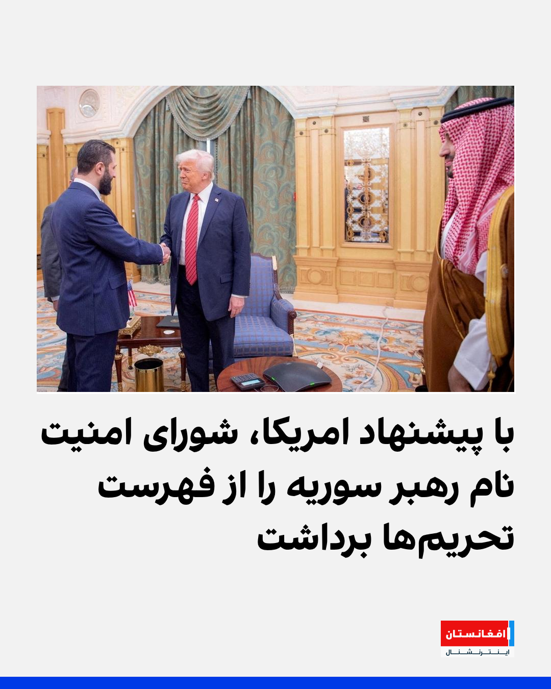 در آستانه دیدار احمد الشرع، رئیسجمهور سوریه با دونالد ترامپ، رئیسجمهور امریکا، شورای امنیت سازمان ملل متحد تحریمها علیه وی را لغو کرد. همچنان، نام انس خطاب، وزیر داخله سوریه نیز از فهرست سیاه شورای امنیت خارج شد.