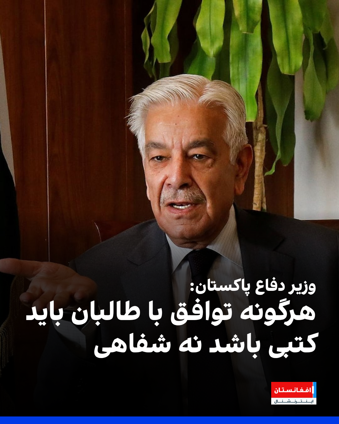 خواجه آصف، وزیر دفاع پاکستان میگوید که هرگونه توافق با اداره طالبان باید کتبی باشد و تفاهمهای شفاهی برای اسلامآباد قابل قبول نیست.