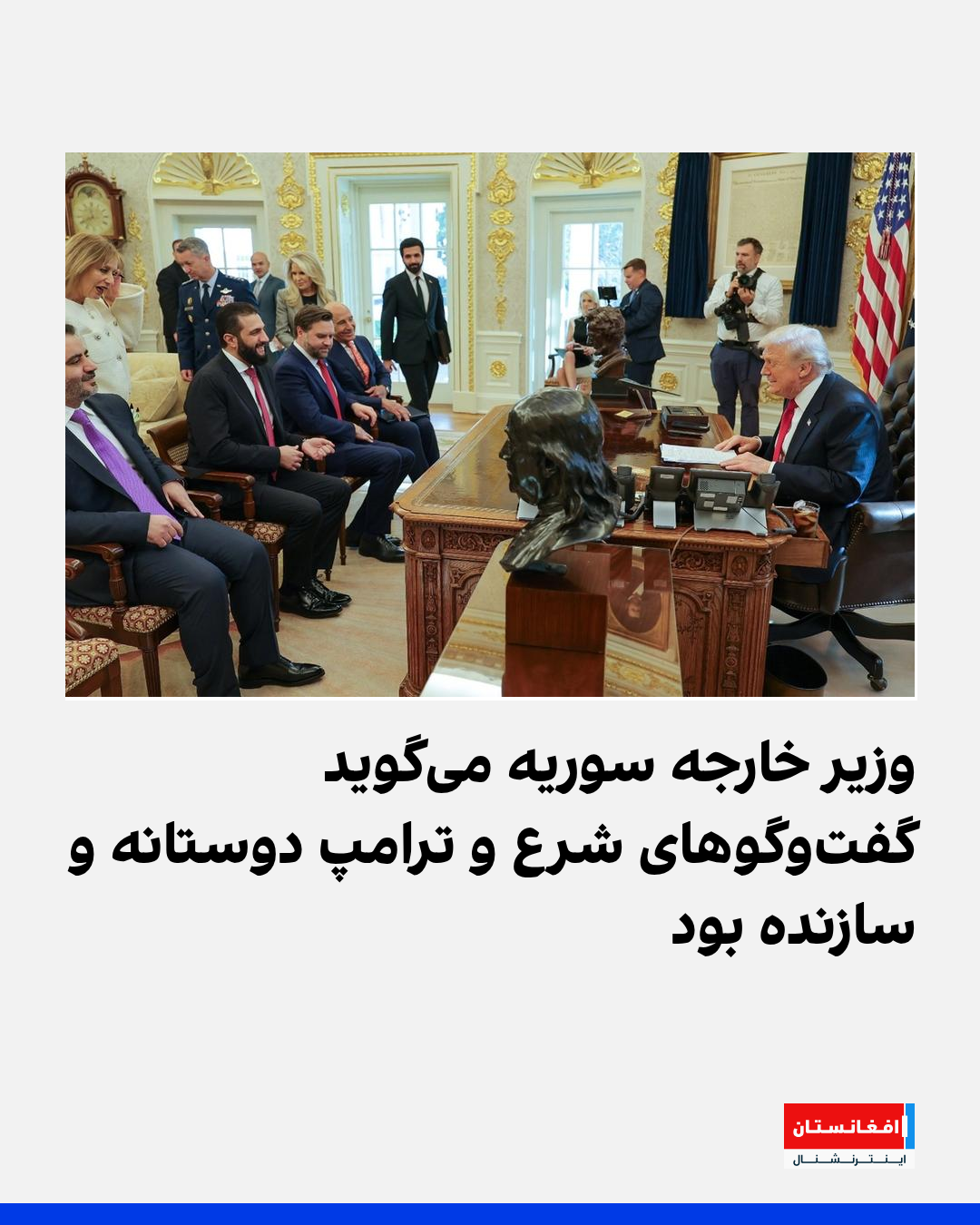 اسعدالشیبانی، وزیر خارجه سوریه روز دوشنبه گفت که دیدار میان احمد شرع، رئیسجمهور سوریه و دونالد ترامپ، رئیسجمهور امریکا، در واشنگتن در فضای «سازنده و مثبت» برگزار شده است.