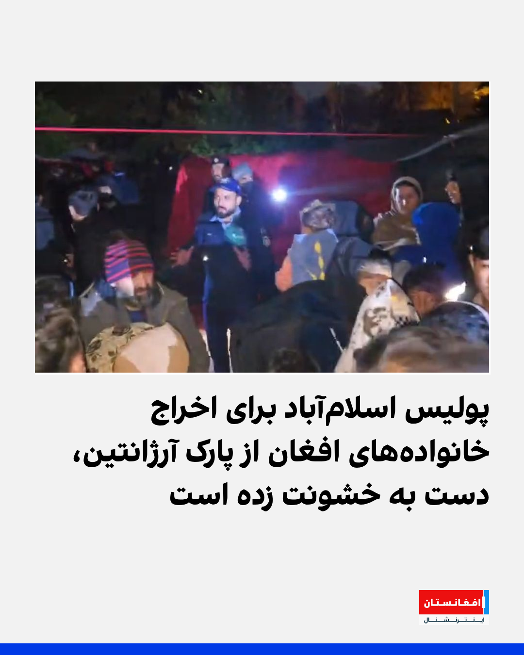 گزارشها از اسلامآباد میرساند که پولیس این شهر نیمهشب سهشنبه، ۴ قوس به پارک مشهور آرژانتین رفته و تلاش دارد خانوادههای مهاجر افغان را که بیش از سه ماه است در زیر خیمهها زندگی میکنند، از آنجا بیرون کند.