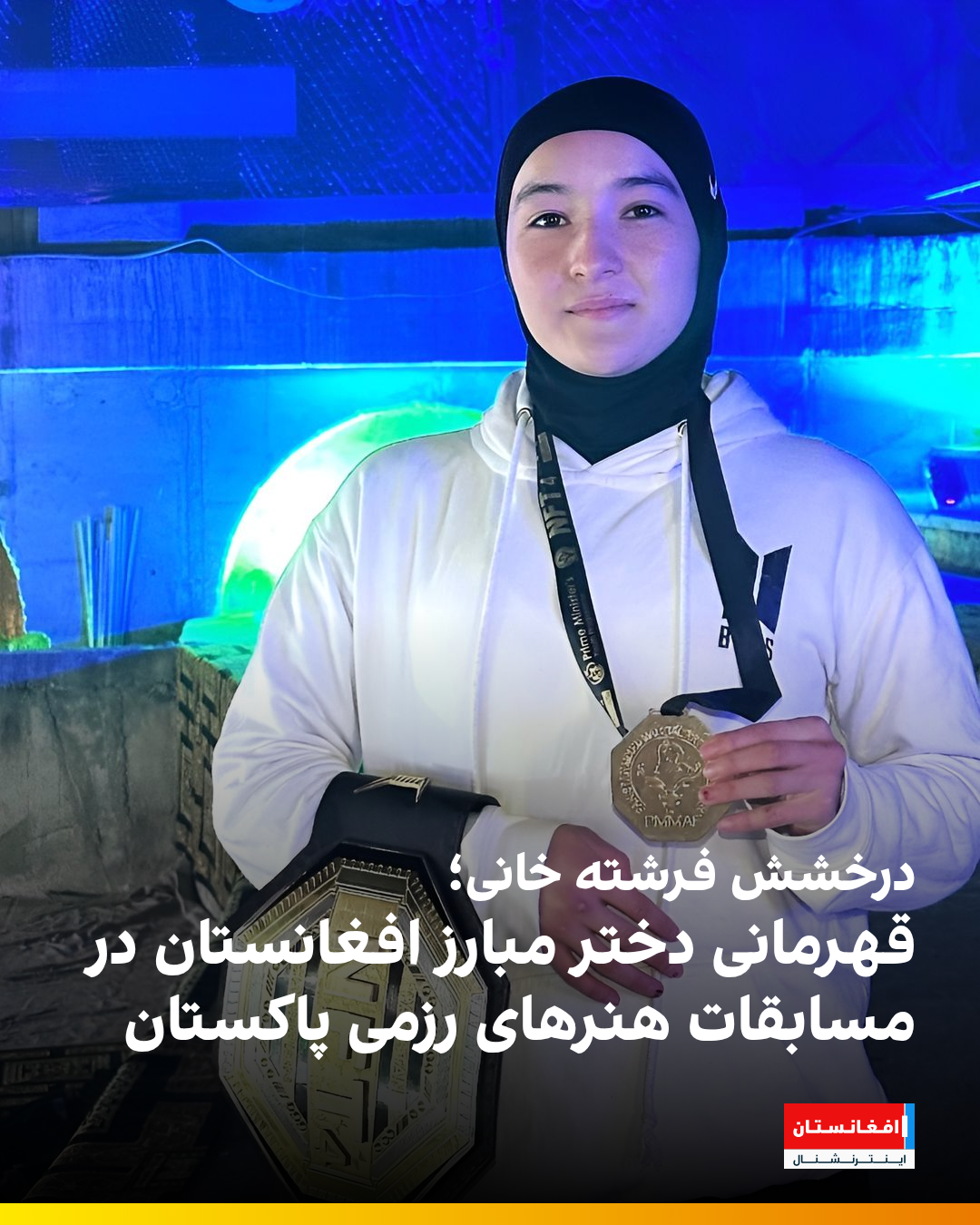 فرشته خانی، دختر ورزشکار و مبارز افغانستان، در مسابقات هنرهای رزمی ترکیبی پاکستان درخشید و توانست عنوان قهرمانی را از آنِ خود کند. او با ثبت چهار پیروزی پیاپی، کمربند قهرمانی این رقابتها را به دست آورد و جایزه نقدی نیممیلیون کلداری را نیز کسب کرد.