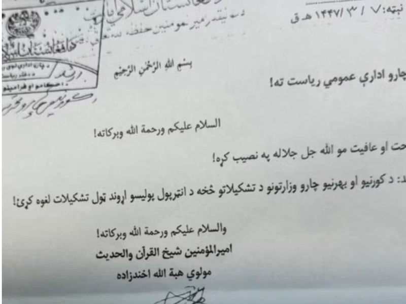Taliban leader Mullah Hibatullah Akhundzada has ordered the dissolution of Interpol police structures within the group’s Interior and Foreign Ministries, according to a document obtained by Afghanistan International.