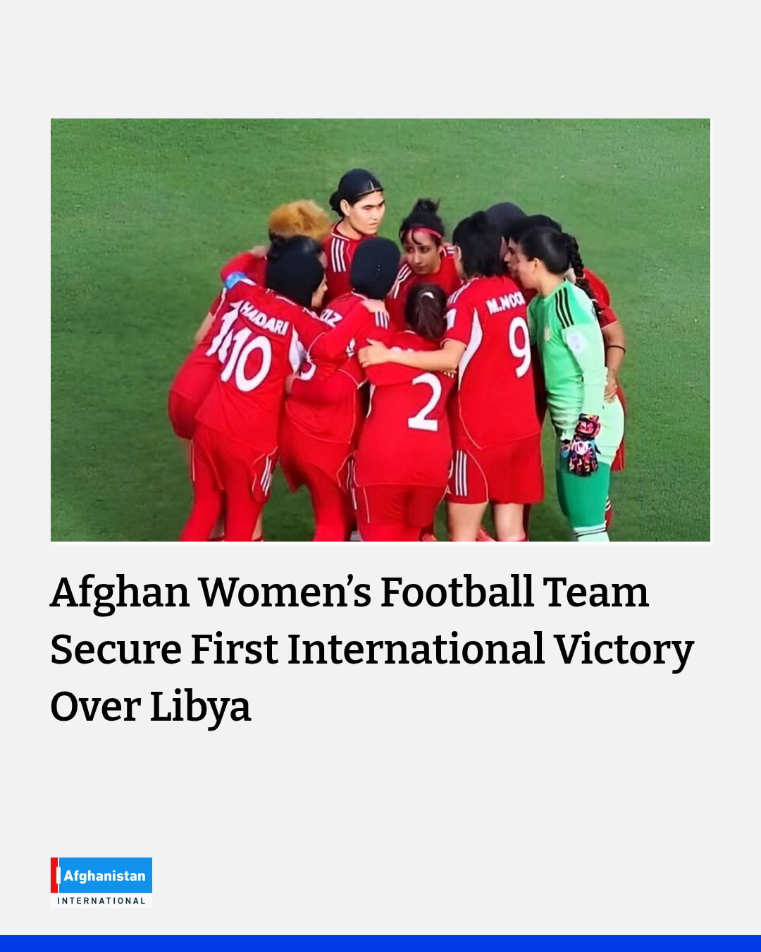 The Afghan Women United football team celebrated its first international victory with an emphatic 7–0 win over Libya in their third match of the FIFA tournament in Morocco.