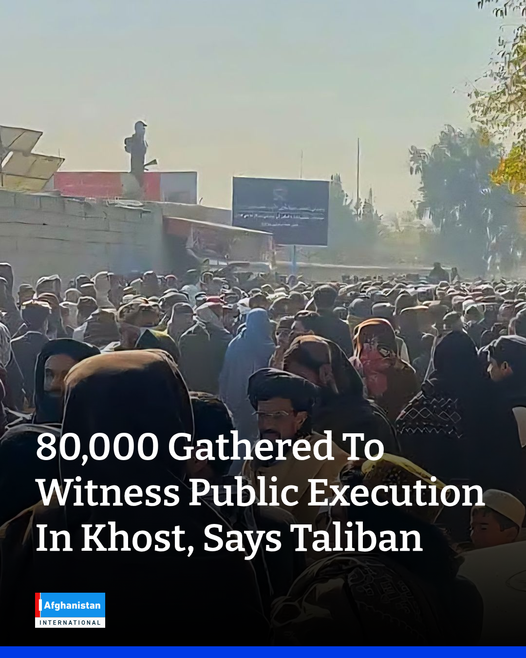 The Taliban governor’s spokesperson in Khost said on Tuesday that an estimated 80,000 people gathered at a stadium in the provincial centre to watch the public execution of a man convicted of premeditated murder. The Taliban had urged the public a day earlier to attend.