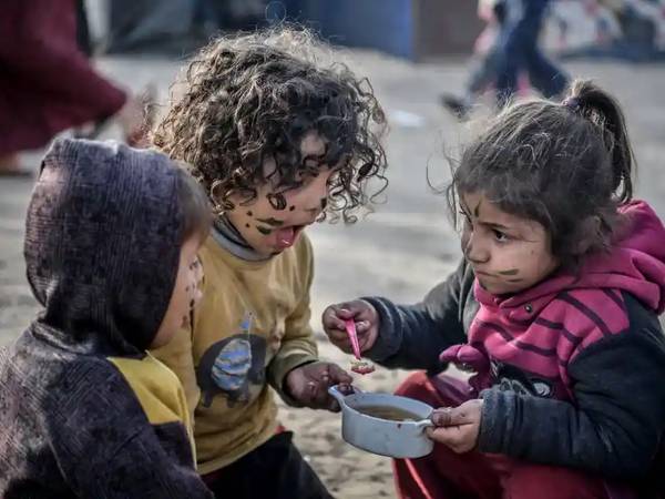 په انځور کې درې فلسطیني ماشومان لیدل کیږي، چې د غزې په رفح سیمه کې د ژوند له سختو شرایطو سره - سره یو بل ته خواړه ورکوي.