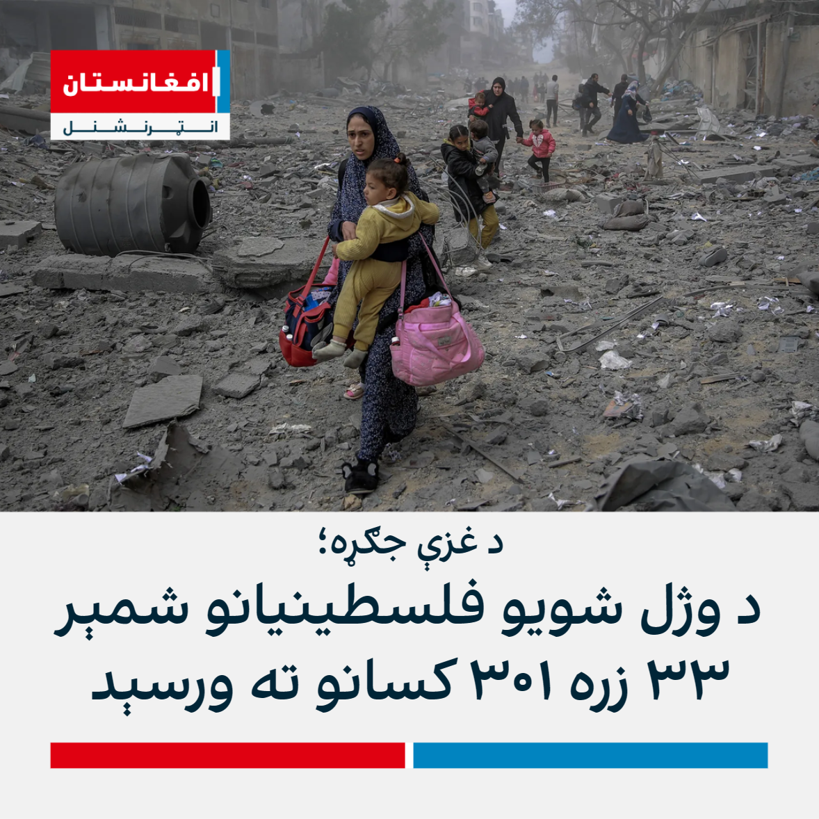 د غزې د روغتیا وزارت وايي، چې د اکټوبر له اوومې راهیسې پر غزې د اسراییل په بریدونو کې لږ تر لږه ۳۳ زره ۳۰۱ فلسطینیان وژل شوي، ۷۵ زره ۳۹۲ کسان ټپیان شوي او له ۸ زرو ډېر ورک دي.