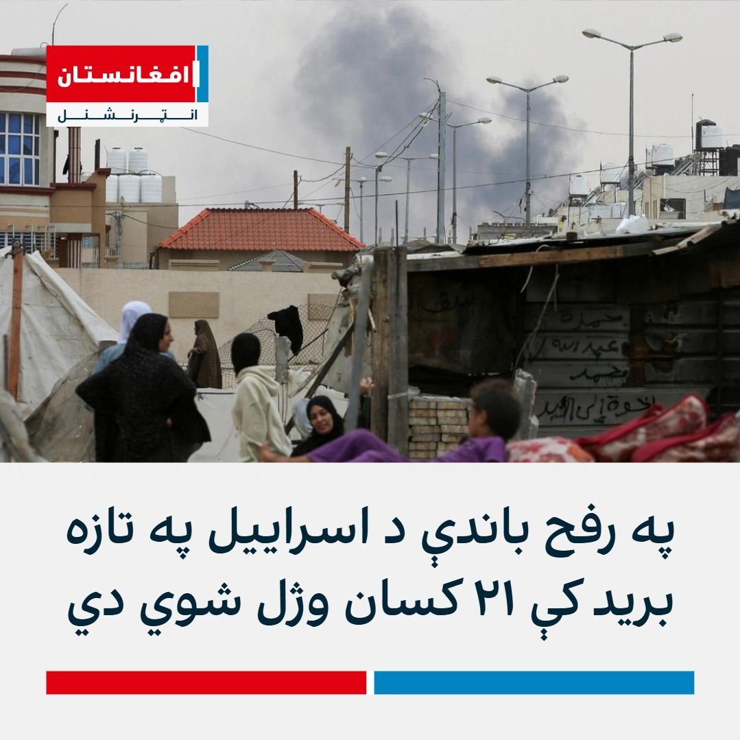 د الجزیرې خبري ټلویزيون د راپور له مخې؛ د رفح په لویدیځ کې د الموصي په سیمه کې پر فلسطیني کډوالو د اسراییل په هوايي برید کې ۲۱ تنه وژل شوي او لسګونه نور ټپیان شوي دي.