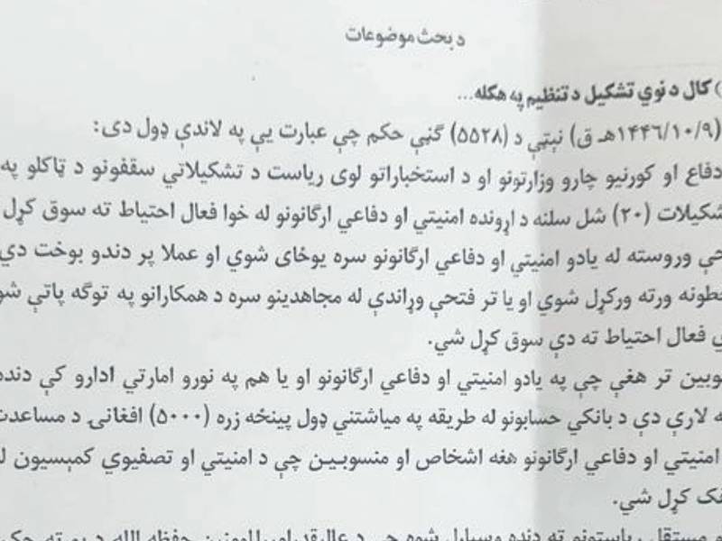 په سند کې راغلي چې د ۱۴۰۴ مالي کال لپاره د طالبانو دفاع او کورنیو چارو وزارتونو او د استخباراتو لوي ریاست د تشکیلاتي سقفونو د ټاکلو په موخه دې د یادو ادارو شل سلنه کارکوونکي فعال احتیاط ته سوق کړل شي.