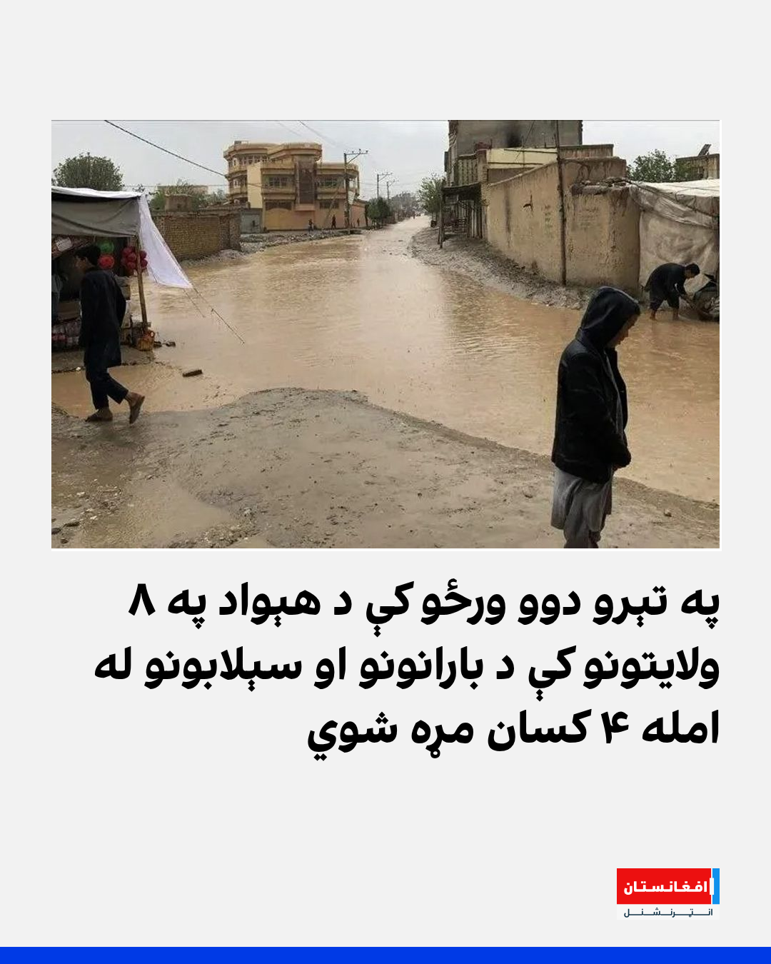 د طالبانو له پېښو سره د مبارزې د چمتوالي اداره وايي، په تېرو دوو ورځو کې د هېواد په اتو ولایتونو کې د بارانونو او سېلابونو له امله ۴ کسان مړه شوي او یو بل ټپي دی.