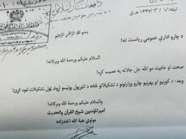 د طالبانو مشر ملاهبت الله دغه مکتوب دوه اونۍ وړاندې ددې ډلې د چارو ادارې عمومي ریاست ته لېږلی دی.
