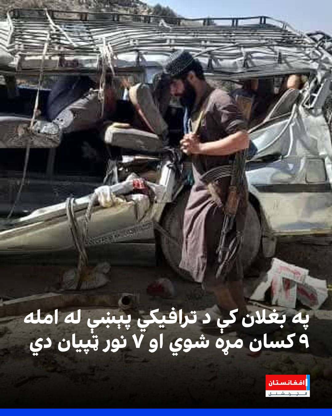 د بغلان ولایت سیمه ییزو طالب چارواکو ویلي، چې د چارشنبې په ورځ د دغه ولایت د جلګې او خوست ولسوالیو ترمنځ د کوتل پلفي په سیمه کې د یوه موټر د چپه کېدو په پېښه کې د دوو ښځو په ګډون ۹ کسان مړه شوي او ۷ تنه نور ټپیان دي.