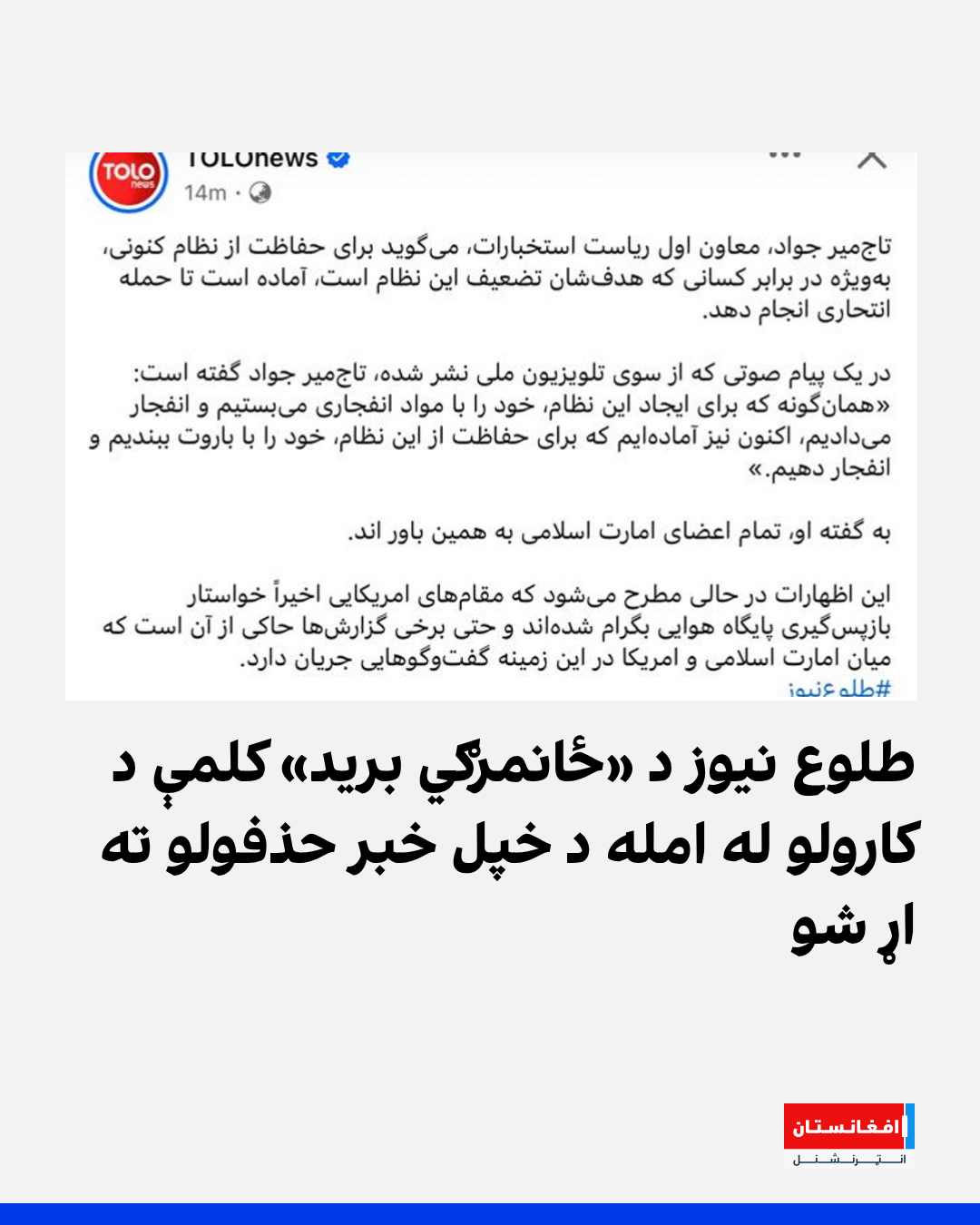 طلوع نیوز د طالبانو د استخباراتو د لومړي مرستیال د وروستیو څرګندونو په تړاو خپل لیکلی خبر د طالبانو د فشارونو له امله بېرته حذف کړ. په دغه خبر کې د تاج میر جواد له قوله لیکل شوي و: «طالبان د خپل نظام د ساتنې لپاره ځانمرګي برید ته چمتو دي.»