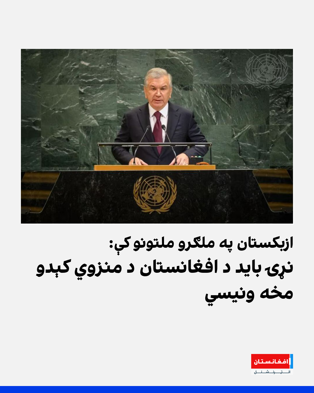 د ازبکستان ولسمشر شوکت میرضیایف د سې شنبې په ورځ (د تلې لومړۍ) د ملګرو ملتونو په عمومي مجمع کې وویل، په افغانستان کې د سولې او ثبات لپاره نړۍواله ټولنه باید په متحد ډول هڅې وکړي. هغه زیاته کړه، د سیمې او نړۍ د امنیت لپاره د افغانستان وضعیت ته باید په نه سترګه ونه کتل شي.