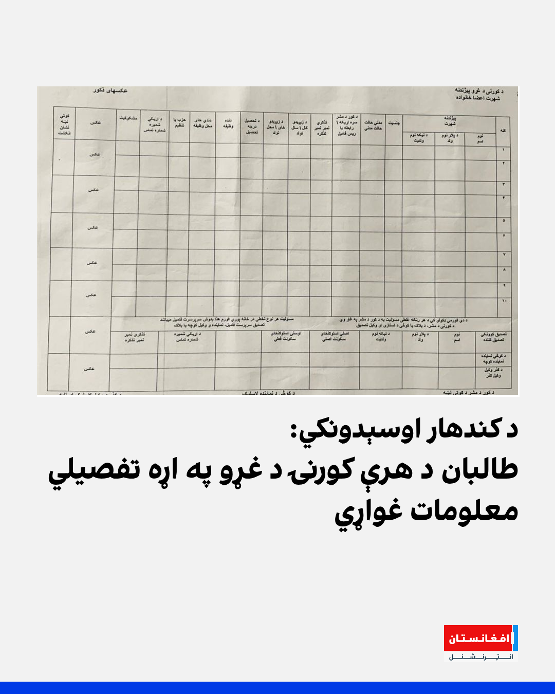 د کندهار د نهمې ناحیې یو اوسېدونکی، چې نه غواړي نوم یې خپور شي افغانستان انټرنیشنل - پښتو ته وویل: «طالبانو دوه کاله مخکې زموږ ټول کورونه ثبت کړي وو، خو اوس یې بیا هر کور ته د ثبت پاڼې وېشلي دي. په دې پاڼو کې له موږ غوښتل شوي چې د کور د هر غړي نوم، عمر، دنده، تېر فعالیتونه او حتی دا چې په کوم ګوند کې خو به غړیتوب نه لري ولیکو.»