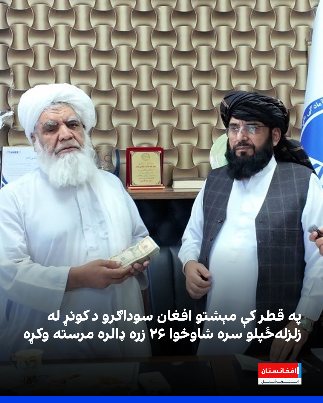 د طالبانو تر واک لاندې د پېښو سره د مبارزې د چمتوالي ملي اداره وايي، په قطر کې مېشتو افغان سوداګرو د کونړ له زلزلهځپلو سره شاوخوا ۲۶ زره او ۳۰۰ ډالره مرسته کړې ده.