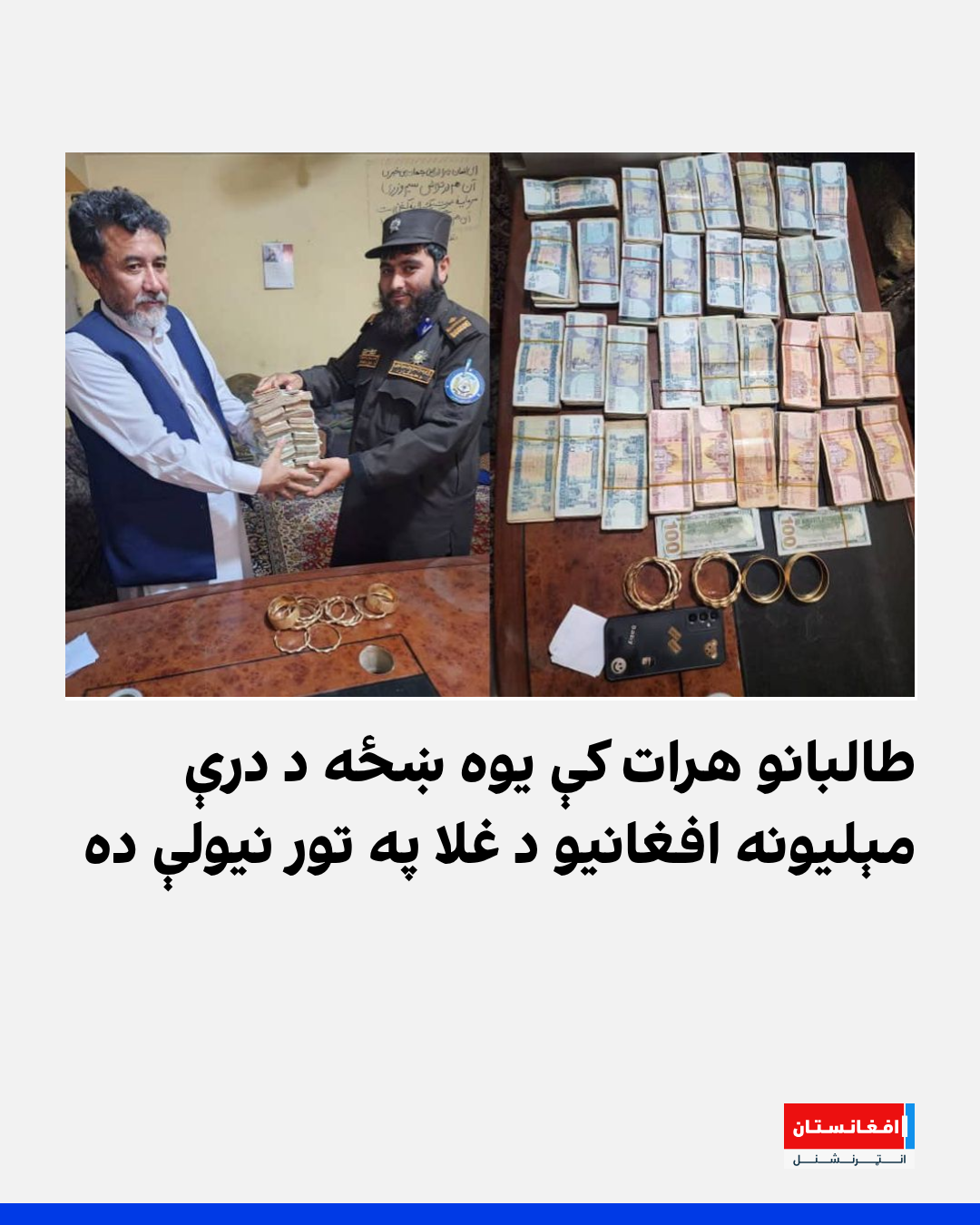 د طالبانو د کورنیو چارو وزارت ویاند عبدالمتین قانع وایي، په هرات ولایت کې د دوی پولیسو یوه ښځه د درې مېلیونه افغانیو په تور نیولې او نوموړې په خپل جرم اعتراف هم کړی دی. هغه زیاتوي، چې له دغه ښځې څخه ترلاسه شوې پیسې بېرته اصلي کس ته هم ورکړل شوې دي.
