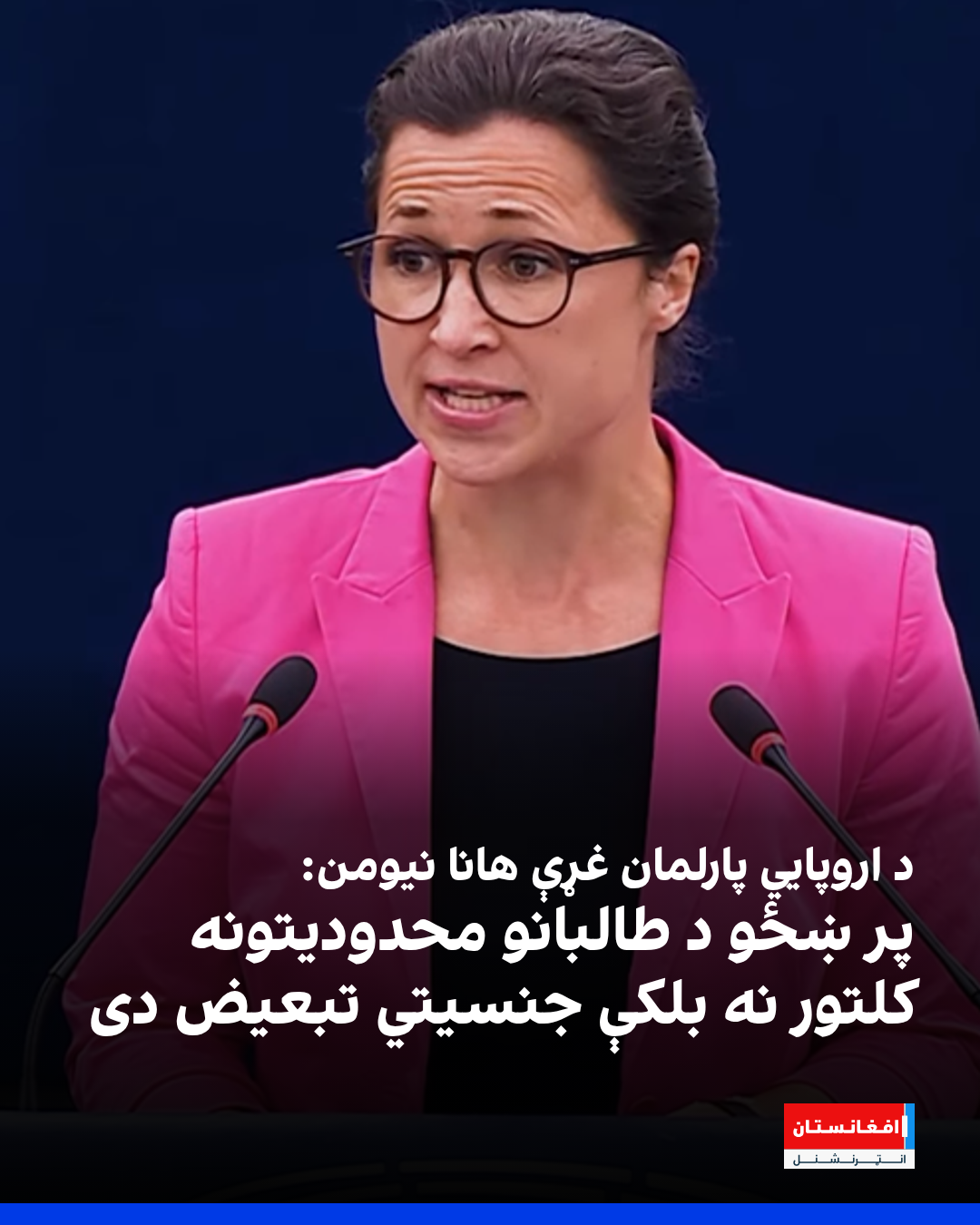 هانا نیومرن د اروپا پارلمان ته د خپلو خبرو په ترڅ کې وویل، افغانستان یوازینی هېواد دی چې نجونې پکې ښوونځي ته له تګ او ښځې له کار، سفر او حتا خبرو کولو منع شوې دي.