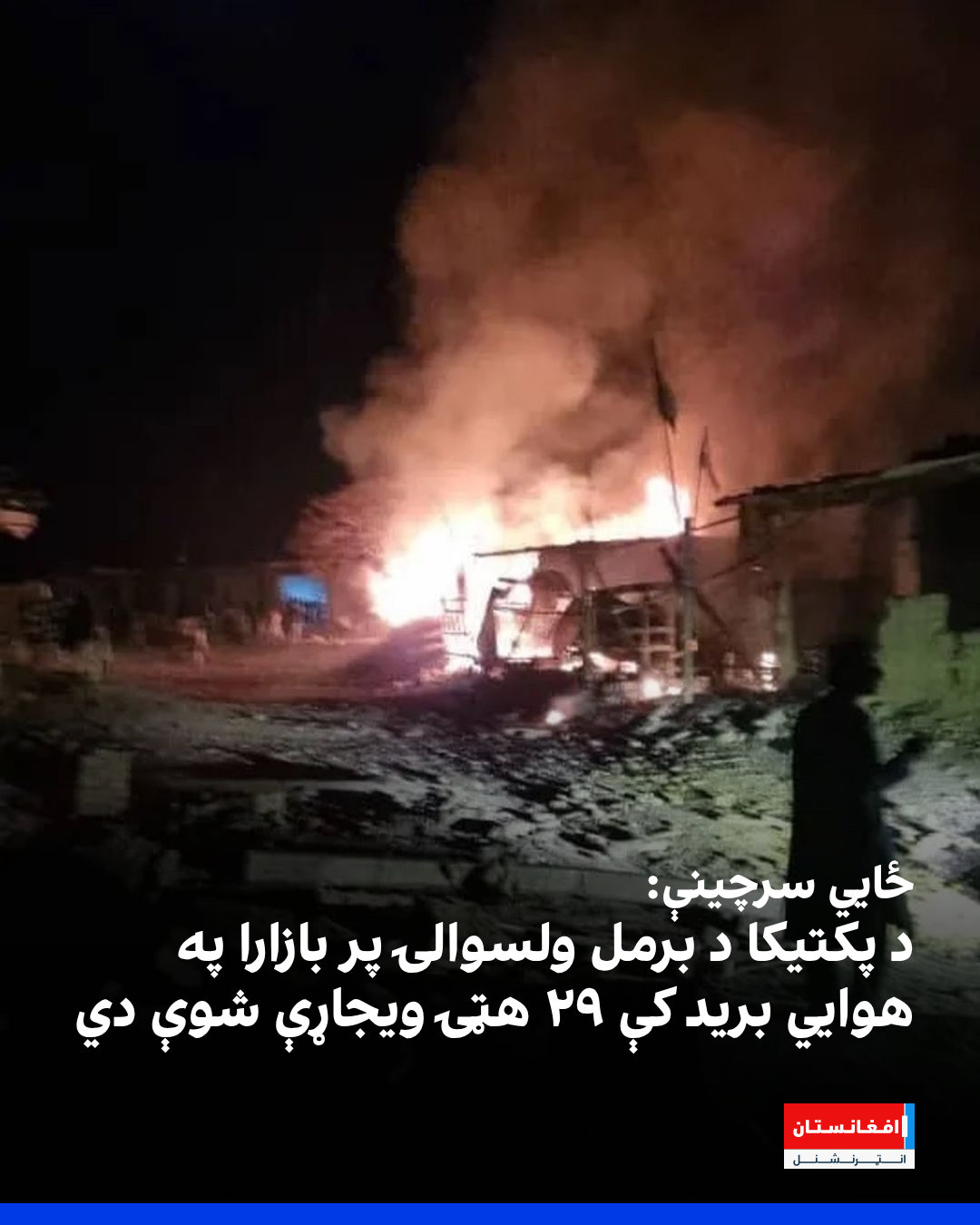 په پکتیکا کې ځايي سرچینو افغانستان انټرنشنل ته ویلي، چې دغه پېښه بېګاه ناوخته د شپې په ۱۲بجو شوې ده. سرچینې وایي، د پکتیکا د برمل ولسوالۍ پر «مرغه بازارا» هوايي برید کې ۲۹ هټۍ ویجاړې شوې دي.