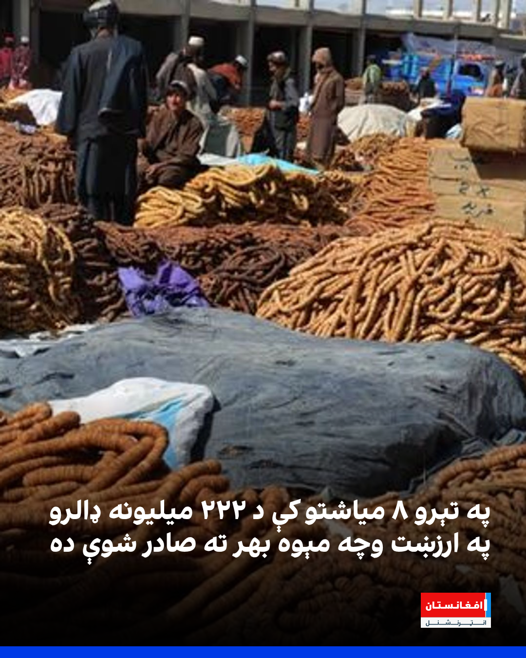 د طالبانو د صنعت او سوداګرۍ وزارت ویاند اخوندزاده عبدالسلام جواد ویلي، چې د روان کال په تېرو اتو میاشتو کې یې د ۲۲۲ میلیونه ډالرو په ارزښت د افغانستان وچه مېوه بهرنیو هېوادونه ته صادر کړې ده.