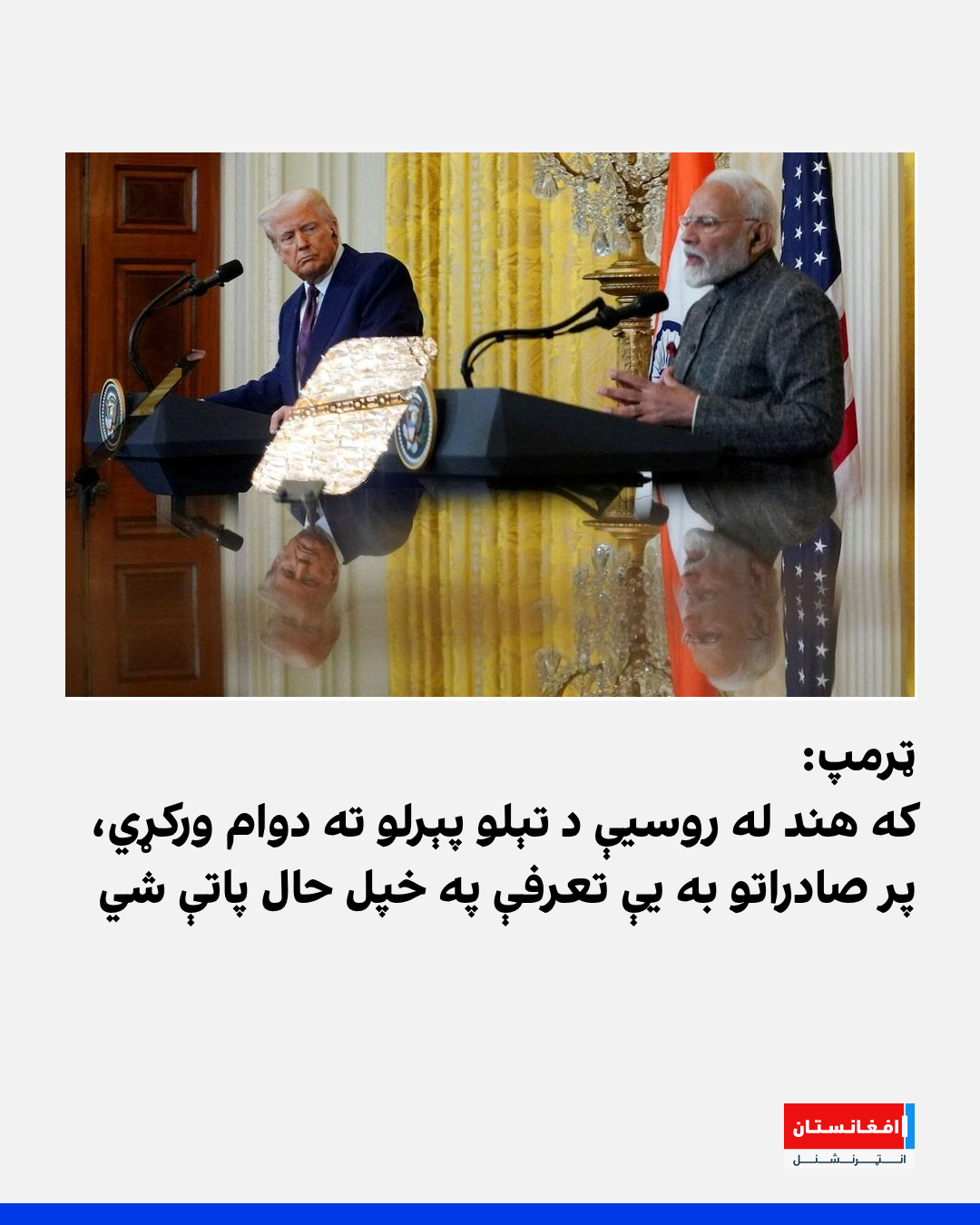 د امریکا ولسمشر ډونالډ ټرمپ د هند لومړي وزیر نرېندرا مودي ته ویلي:« له روسېې نه دې نور تېل نه پېري؛ خو که زما خبره و نه منې، نو پر هندي صادراتو به لګول شوې تعرفې پر خپل حال پاتې شي.»