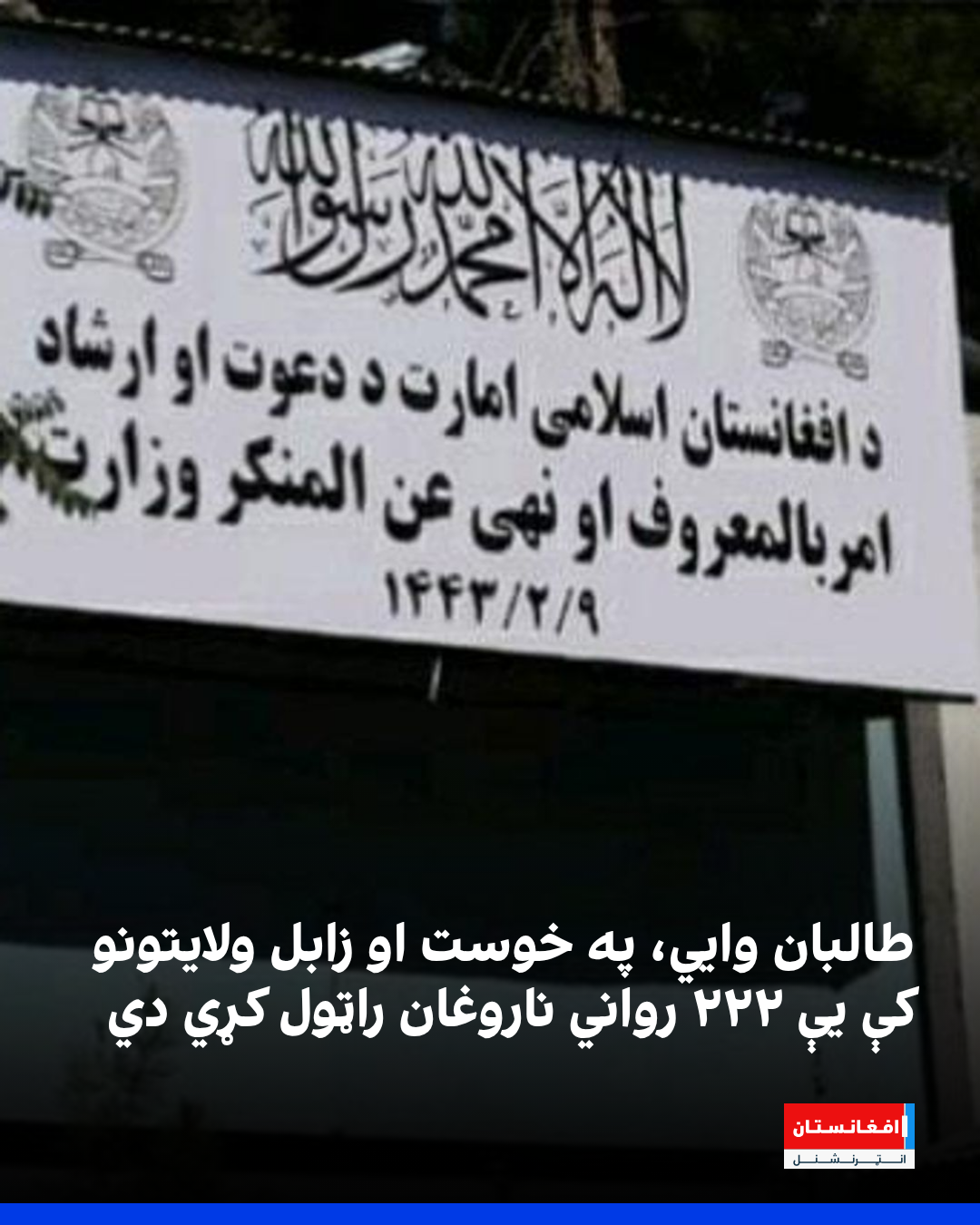 د طالبانو د امر بالمعروف، نهې عن المنکر او شکایتونو اورېدو وزارت چهارشنبه (د تلې ۳۰مه) ویلي، چې د طالبانو د مشر د ځانګړي فرمان له مخې یې په زابل او خوست ولایتونو کې ۲۲۲ رواني ناروغان راټول کړي او د درملنې لپاره یې د سرې میاشتې ولایتي ریاستونو ته سپارلي دي.