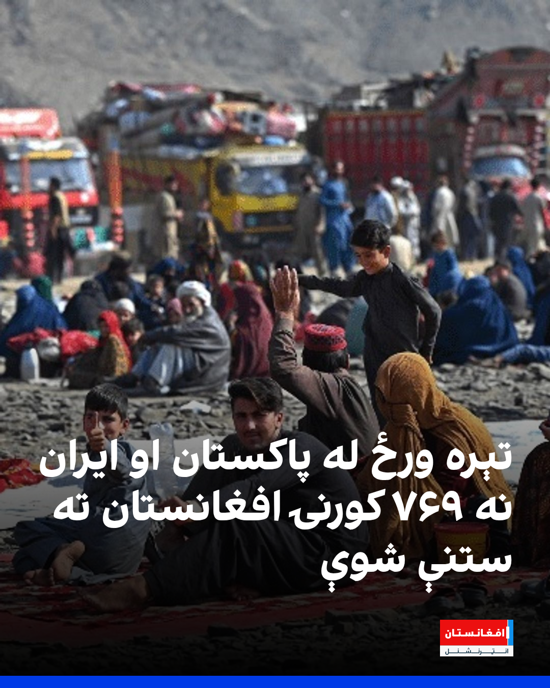 د طالبانو تر واک لاندې باختر اژانس خبر ورکړی چې تېره ورځ شنبه د (لړم ۲مه) له ایران او پاکستان نه ۷۶۹ افغان کورنۍ خپل هېواد ته ستنې شوي.