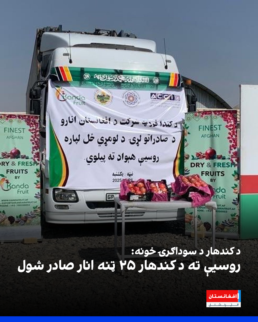 د کندهار د سوداګرۍ خونې رییس عبدالواحد صدیقي وايي، د یکشنبې په ورځ یې د انارو د سږنيو حاصلاتو صادرات په لومړي ځل د روسیې هېواد ته پیل کړل. نوموړي ویلي، چې په لومړی جوپه کې ۲۵ ټنه انار بار وو، چې ارزښت یې تر ۲۵ زرو ډالرو پورې رسیږی.