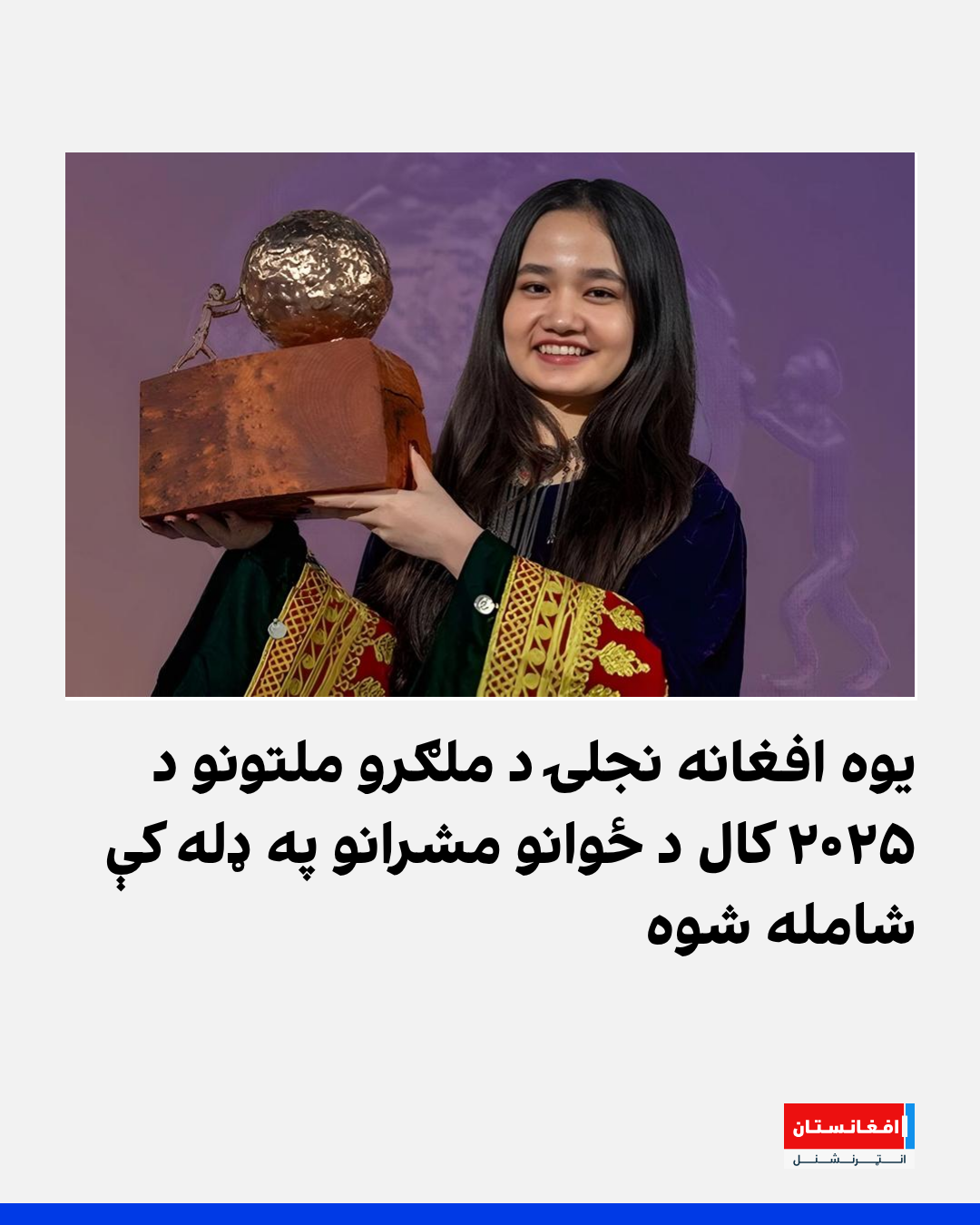 یوه ځوانه افغانه نجلۍ نیلا ابراهیمي د ملګرو ملتونو د دوامداره پراختیایي اهدافو لپاره د ۲۰۲۵ کال د ۱۷ ځوانو مشرانو په ډله کې شامله شوې ده. نیلا ابراهیمي تېر کال د ماشومانو د سولې نړۍواله جایزه تر لاسه کړې وه.