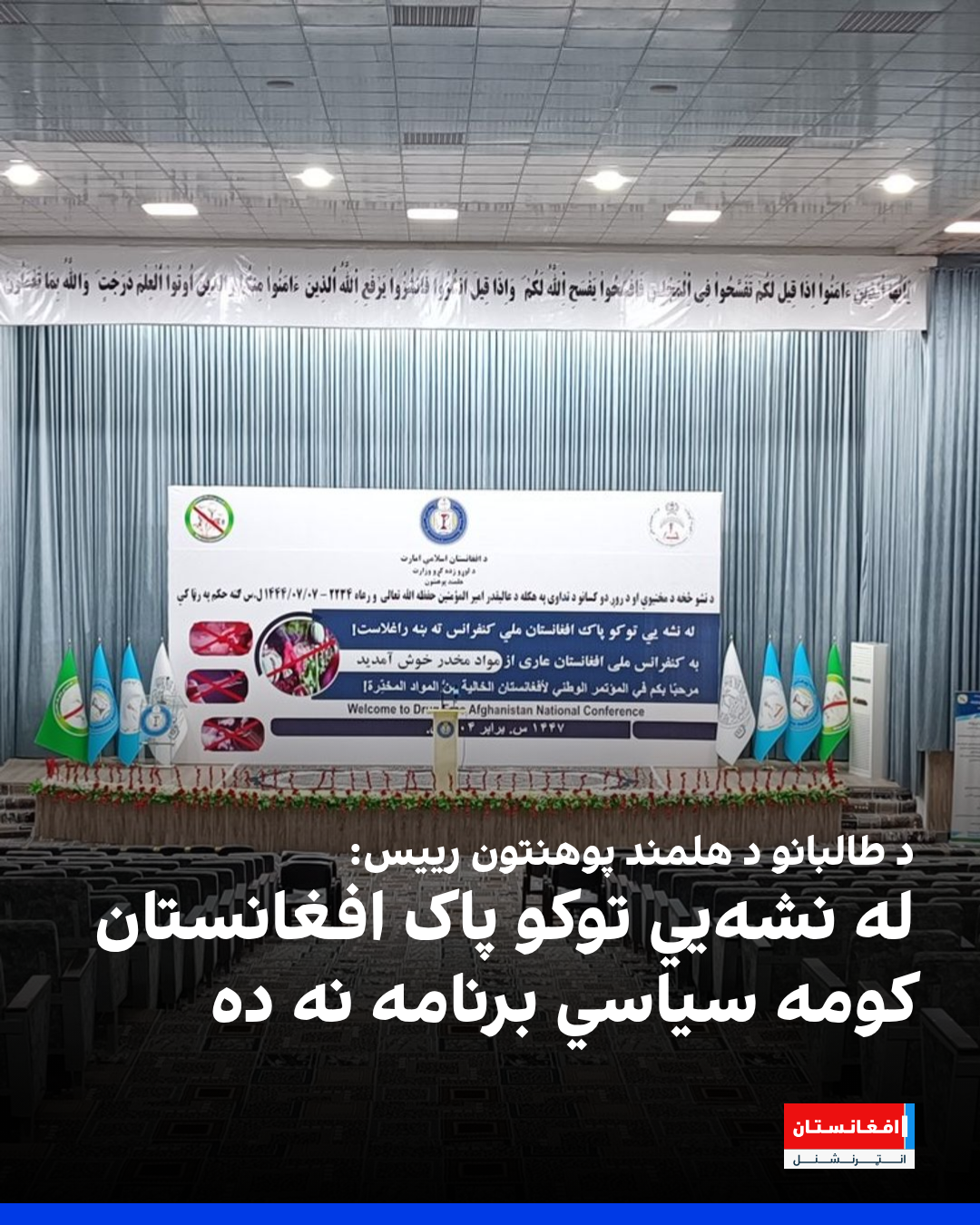د طالبانو د هلمند پوهنتون رییس محمد شریفالله ابو احمد «له نشهیي توکو پاک افغانستان» کنفرانس کې ویلي، چې له نشهيي توکو پاک افغانستان کومه سیاسي برنامه نه، بلکې د دې بدې پدېدې مخنیوی ددوی شرعي مکلفیت دی.