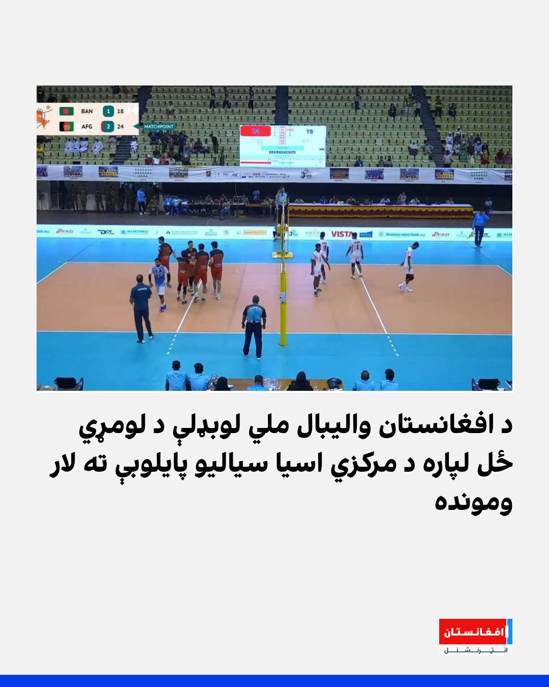 د افغانستان د والیبال ملي لوبډلې د مرکزي اسیا د والیبال سیالیو په پنځمه لوبه کې کوربه لوبډلې بنګلهدېش ته ماتې ورکړه. د هېواد د والیبال ملي لوبډلې د ۳ پر ۱ پایلې په ترلاسه کولو سره د لومړي ځل لپاره د دغو سیالیو پایلوبې ته لار وموندله.