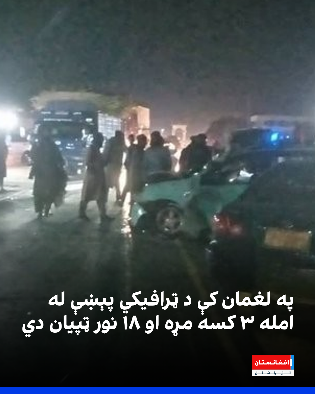 په لغمان ولایت کې د طالبانو د ټرافیکو مدیر حبیب الله مبارز وایي، چې بېګاه شپه د لغمان ولایت اړوند «سرخکانو چوک» ته نږدې د درېیو موټرو د ټکر له امله د یوې مېرمنې په ګډون ۳ کسه مړه او ۱۸ نور ټپیان شوي دي.
