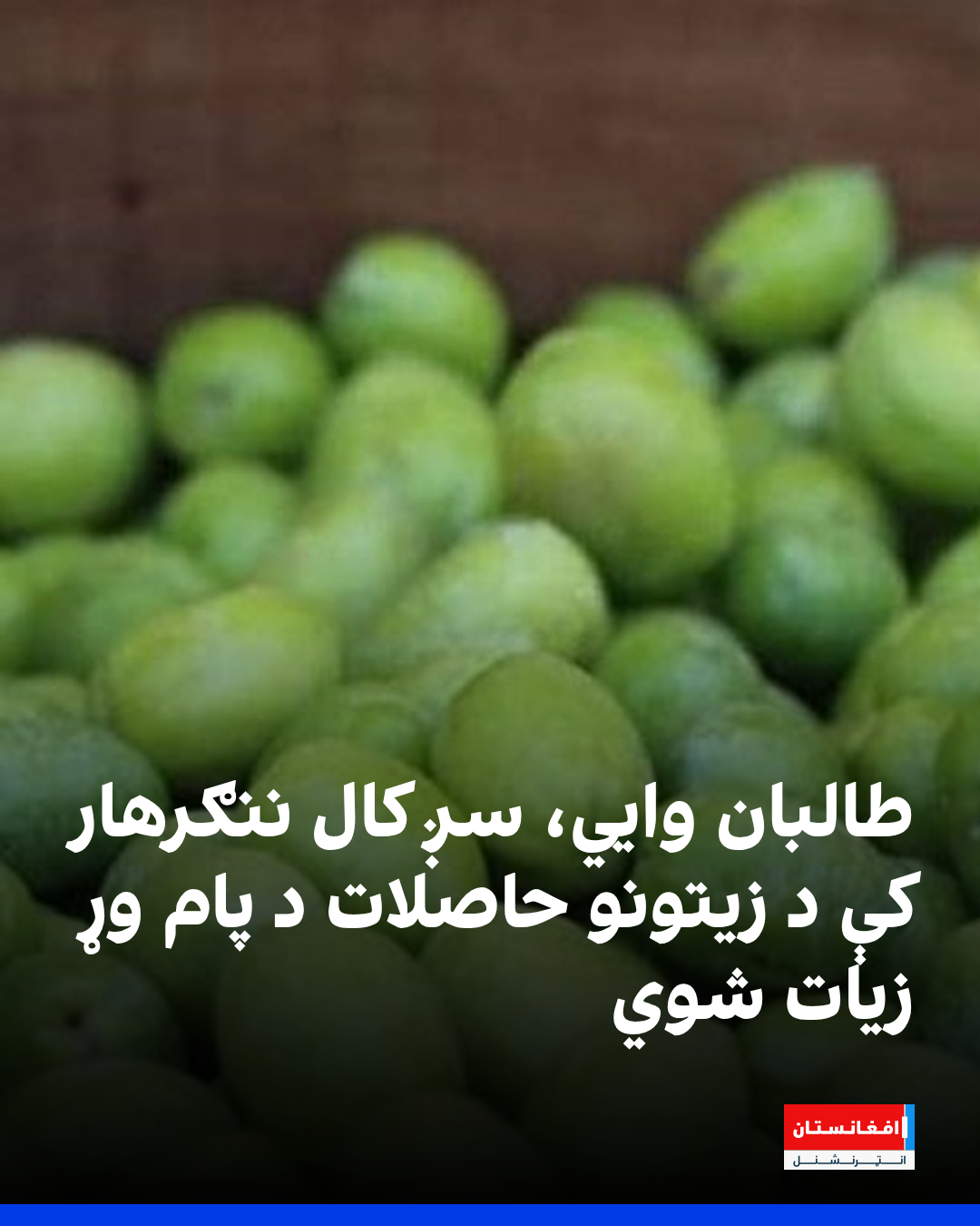 د طالبانو په واک کې د افغانستان ملي راډیو ټلویزیون د طالبانو کرنې وزارت په حواله ویلي چې د ننګرهار وادي کانال ریاست د زیتونو تولیدات سږکال د تېر کال پرتله ۴۰ سلنه زیات شوي دي.
