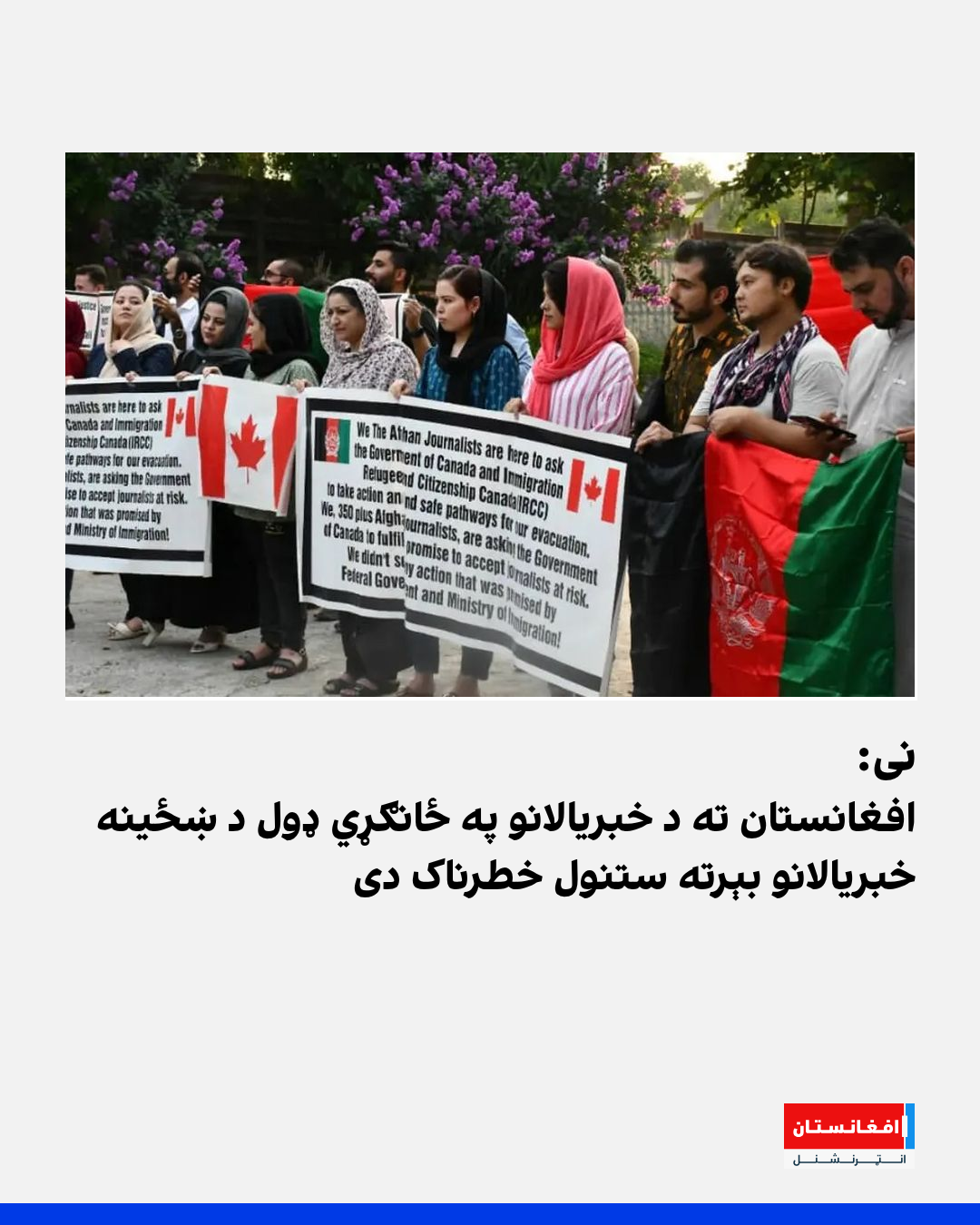په جلا وطنۍ کې د افغانستان د ازادو رسنیو د ملاتړ بنسټ (نی) په پاکستان کې د مېشتو خبریالانو د نیولو او شړلو په غبرګون ویلي، چې افغانستان ته د خبریالانو په ځانګړي ډول د ښځینه خبریالانو بېرته ستنول خطرناک دی.