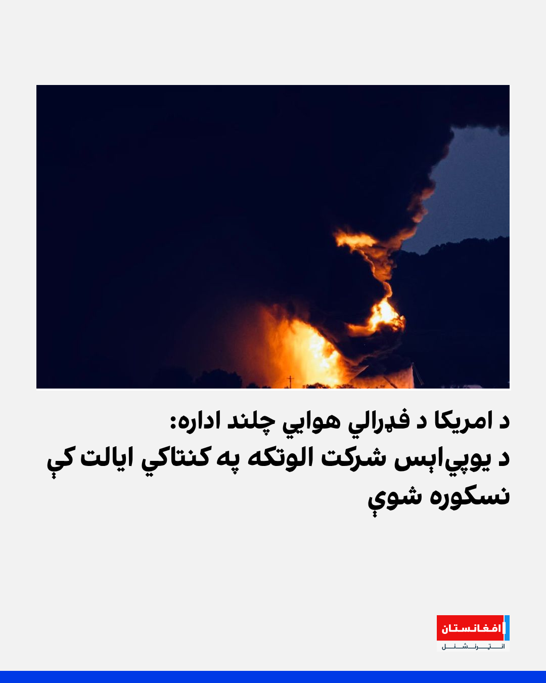 د امریکا د فډرالي هوايي چلند ادارې اعلان کړی، چې د یوپياېس شرکت یوه الوتکه د محمدعلي له هوايي ډګر څخه له الوتنې وروسته د کنتاکي ایالت په لويېویل ښار کې نسکوره شوې ده.