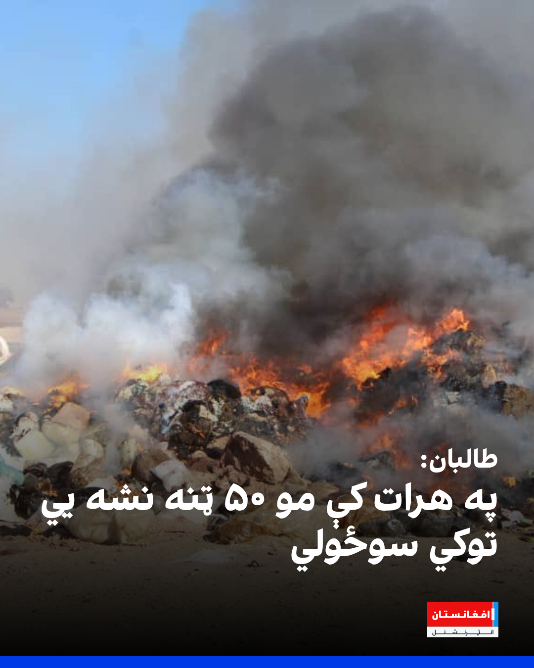 د طالبانو د کورنیو چارو وازرت ویلي، چې په هرات ولایت کې کې یې ۵۰ ټنه نشه يي توکي چې تریاک، شیشه، هیروین، چرس، نشه يي ټابلیټ، زرګونه لیټره الکولي مشروبات، لسګونه زره کیلو ګرامه اومان او ایف مواد سوځولي دي.