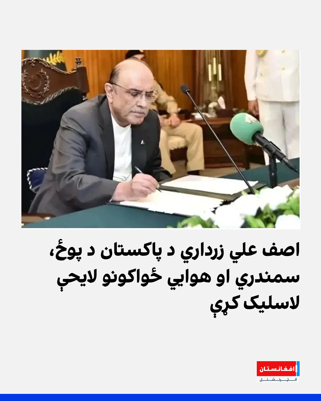 د پاکستان ولسمشر اصف علي زرداري د شنبې په ورځ د وسلهوالو ځواکونو د درېیو برخو (پوځ، هوايي او بحري ځواک) اړوند مسودې لاسلیک کړې. د وسلهوالو ځواکونو اړوند لایحې یوه ورځ وړاندې د سنا له لارې تصویب شوې وې.