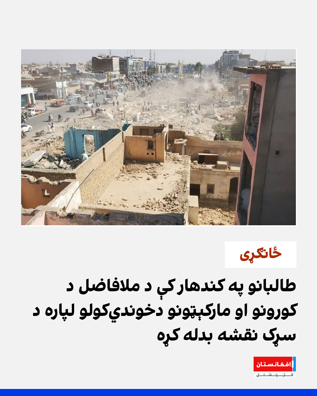 د کندهار ښاریانو د سې شنبه په ورځ (د لړم ۲۷مه) افغانستان انټرنشنل ـ پښتو ته ویلي، چې طالبان د نوې نقشې له مخې د جوړېدونکي سړک لپاره سلګونه کورونه نړوي، خو د دوی په وینا نه استملاک ورکول کېږي او نه د بديلو ځمکو ورکړه عملي شوې ده.