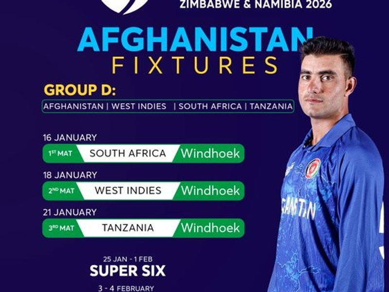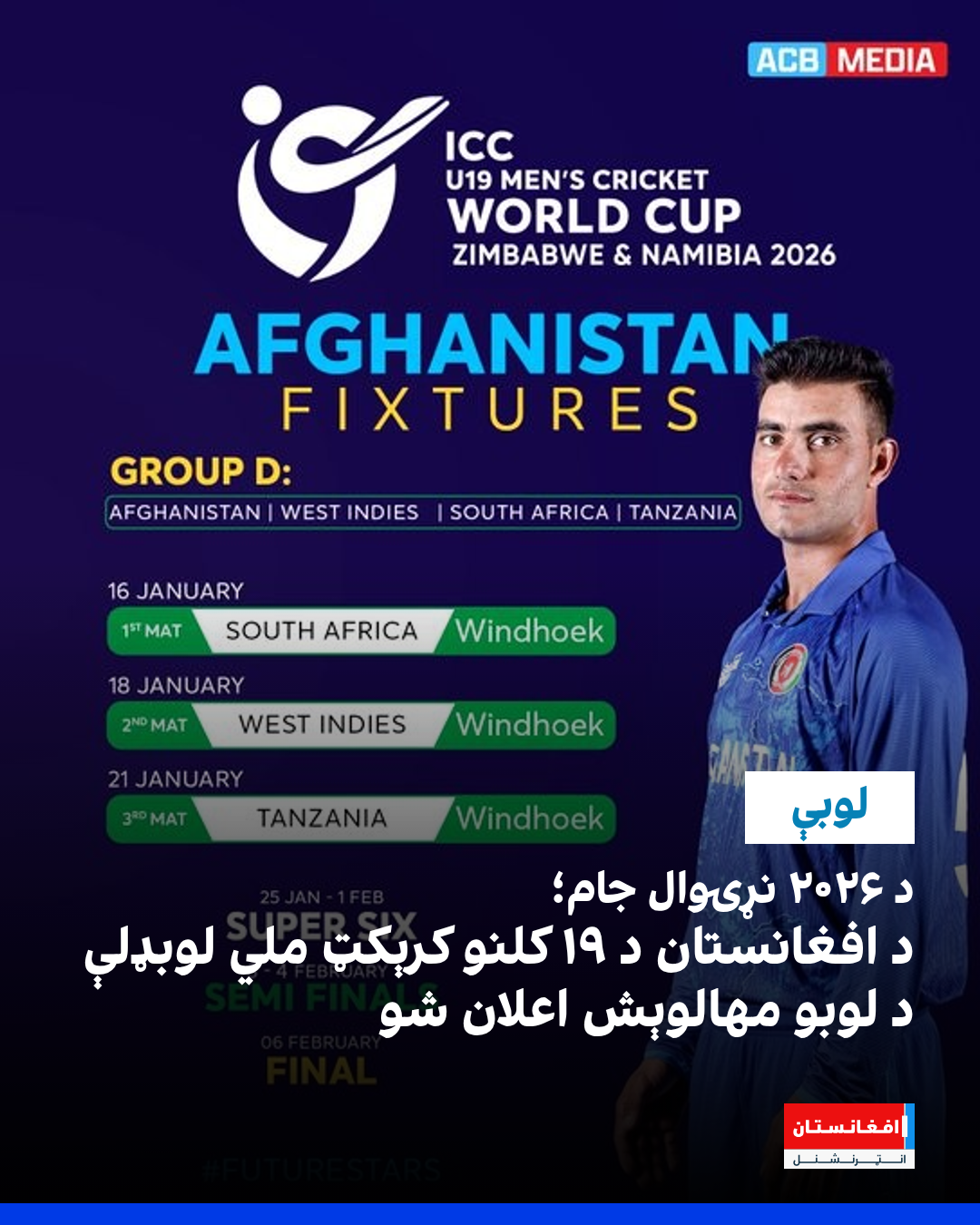 د افغانستان کرېکټ بورډ د ۲۰۲۶کال د ۱۹ کلنو نړۍوال جام لوبو مهالوېش اعلان کړ. د دغه مهالوېش له مخې؛ د افغان لوبډلې لومړۍ لوبه د راتلونکي ۲۰۲۶کال د جنورۍ په ۱۶مه نېټه د سویلي افریقا لوبډلې پر وړاندې ده.